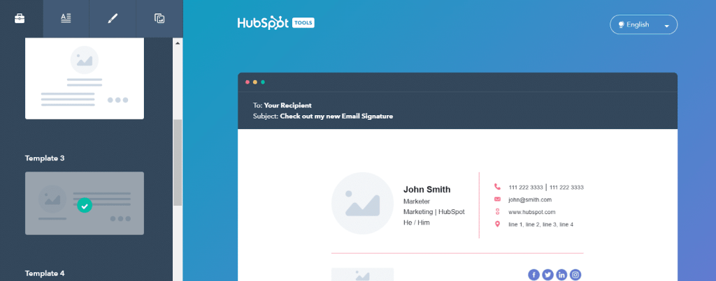Select from six different templates, fill out your information, and select your brand colors. If you have a custom image, like a logo, you can add that to your Hubspot signature, too. Hubspot branding is added by default but can be removed.